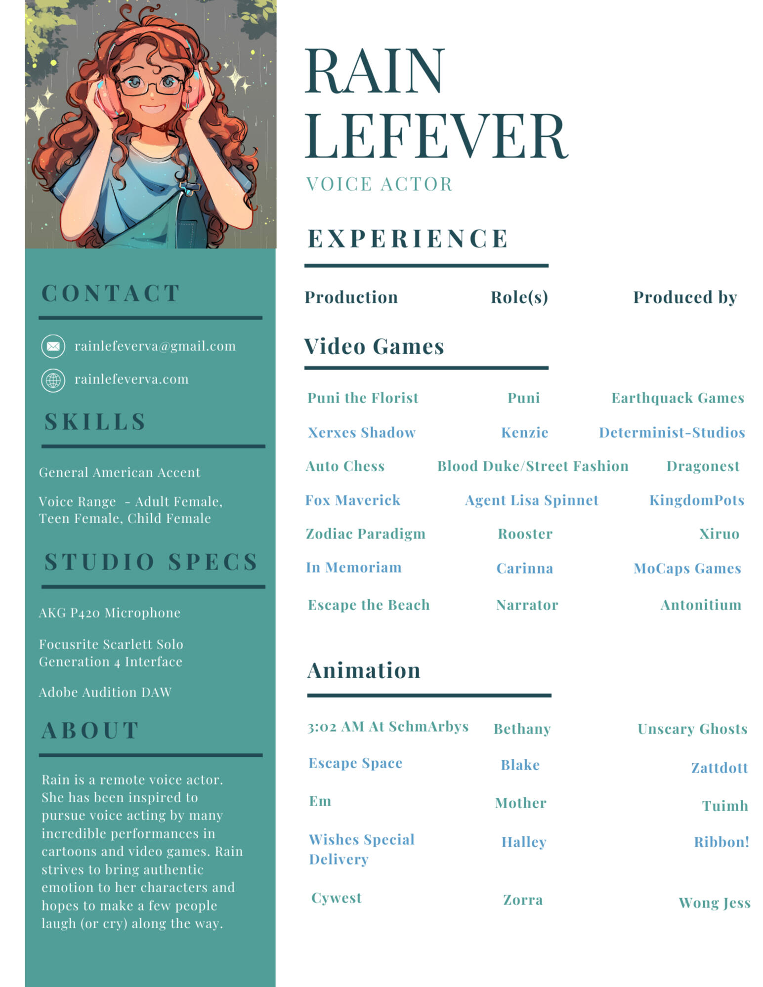 Rain is a remote voice actor. She has been inspired to pursue voice acting by many incredible performances in cartoons and video games. Rain strives to bring authentic emotion to her characters and hopes to make a few people laugh (or cry) along the way.