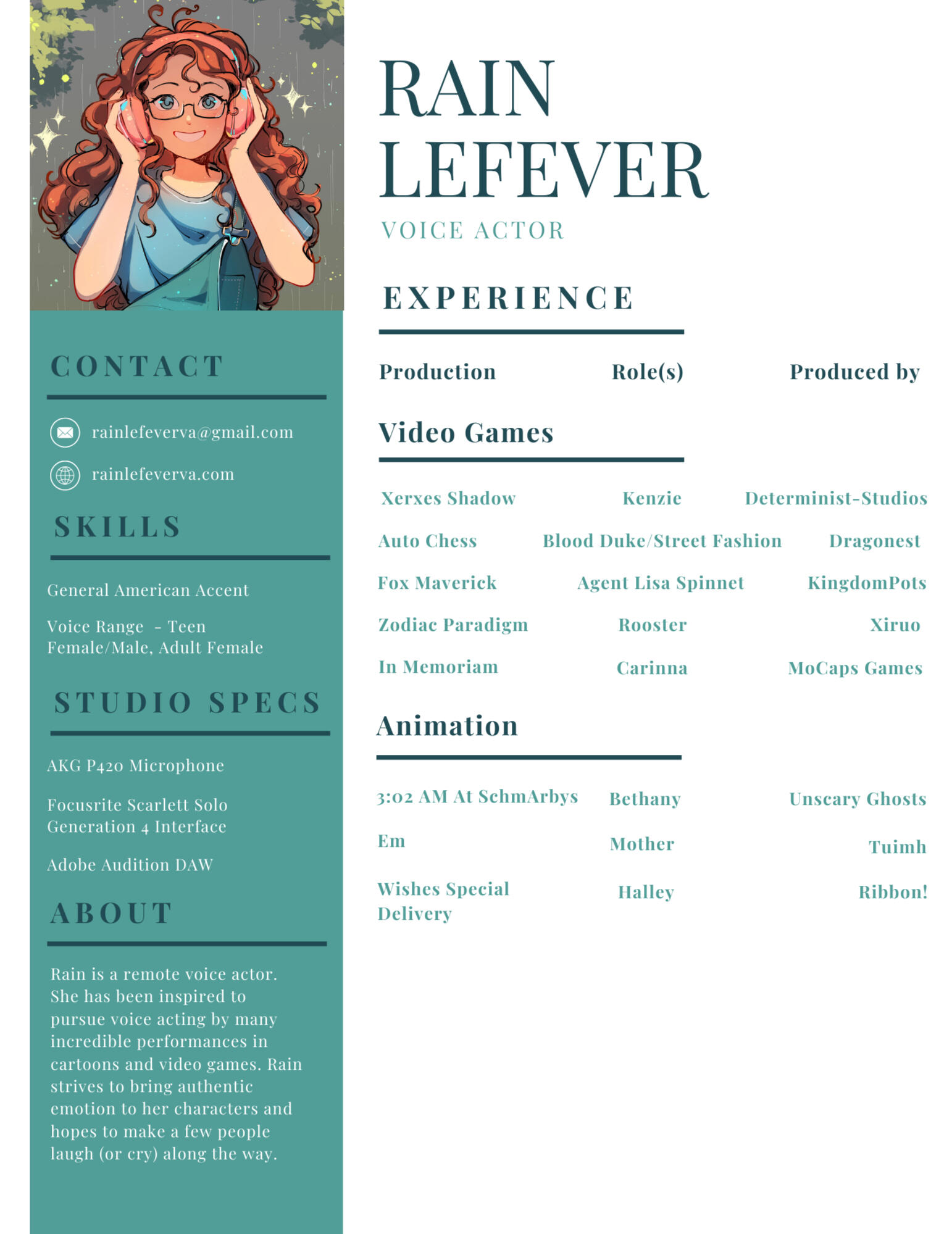 Rain is a remote voice actor. She has been inspired to pursue voice acting by many incredible performances in cartoons and video games. Rain strives to bring authentic emotion to her characters and hopes to make a few people laugh (or cry) along the way.